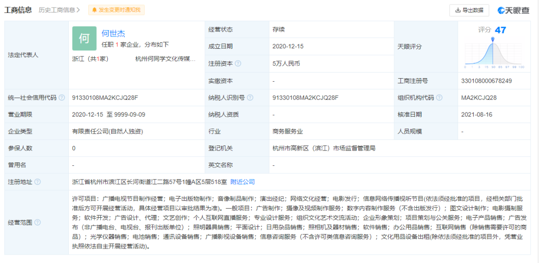 天眼查显示,何世杰(何同学本名)于今年8月16日创立了杭州何同学文化传媒有限公司,认缴资金5万元,主营项目为广播电视节目制作——也就是自媒体。