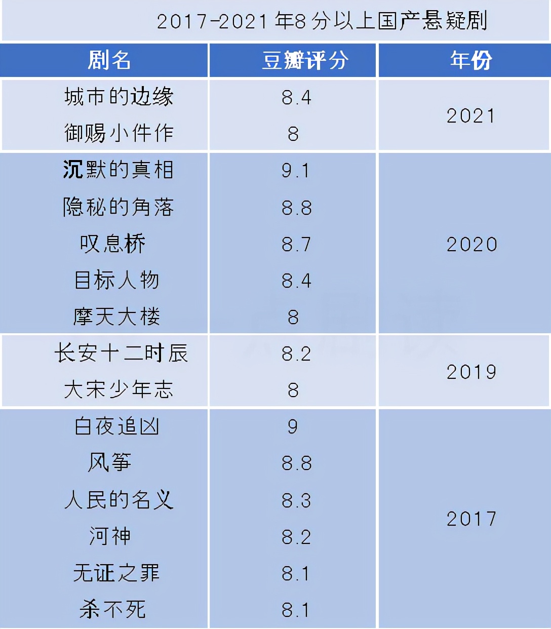 三部悬疑剧登顶市场之后,爱奇艺、优酷、芒果tv相继开展“剧场”模式,腾讯则在基于大IP的基础上,每个季度都会上新几部悬疑题材。但据相关数据显示,口碑悬疑剧产出量最多的年份,依旧是2017年——有6部豆瓣过8分作品,其次则是2020年的5部,2019年和2021年都仅有2部入围。