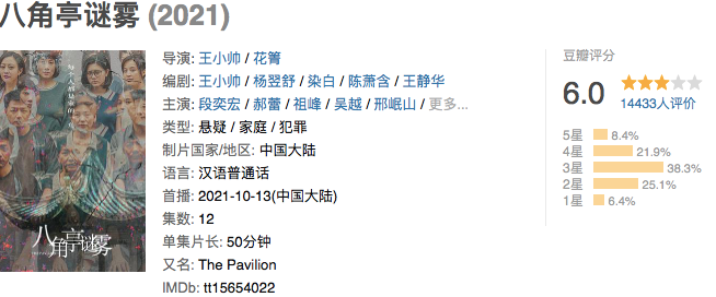 相关数据显示,《八角亭谜雾》自播出以来,全网最高热度仅达到68(骨朵),爱奇艺站内热度值破7000的成绩,虽超越同期其他在播剧,但距离爆款仍存在不小差距。令人感到诧异的是,这部剧的豆瓣评分,目前仅达到6.0,豆瓣上除去38%网友给出三星评价外,一二星与四五星打分人数五五开的现象,也凸显出这部剧严重的口碑两极分化。