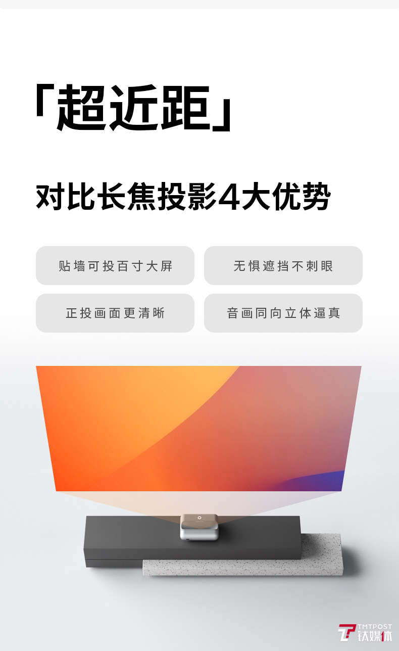 画质方面,坚果投影联合徕卡深度研发,实现自研LED超短焦光机,进一步将坚果智慧墙O1 Pro的投射比缩短至0.21:1,成为当前LED超短焦智能投影市场上投射比最小、离墙最近的产品。