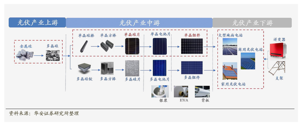 光伏行业基本分为两种技术路线,就是晶硅和薄膜,而晶硅又分为单晶硅和多晶硅两种。多晶硅是由自然界的沙子,经过化学反应提纯而来,可制成光伏面板重要部件,能够将太阳能转化为电能。多晶硅又可以作为拉制单晶硅的原料。