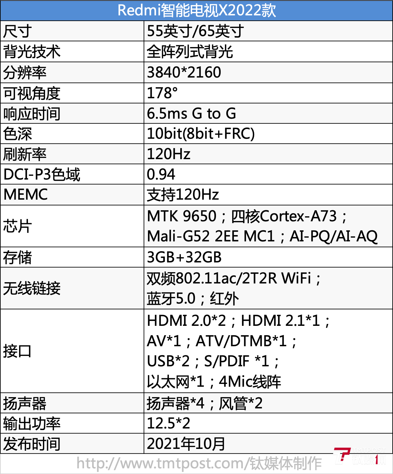 首先让我们来看看Redmi X65 2022款的硬件参数:![]()