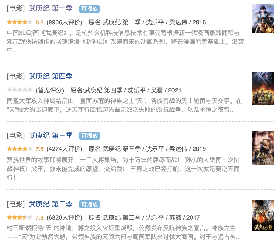 但持续投入了四季动画,评分却在下行,其定位是“超强脑洞封神演义”,却被观众吐槽把熟悉的名字安在了全新的角色上,与封神演义一点关系都没有。另一部动画《天谕》则根据网易盘古工作室的同名游戏改编,2017年上线的《天谕》动画第一季豆瓣只有898人评价,分数4.8分,2018年开播的第二季凉到豆瓣都没开评分。