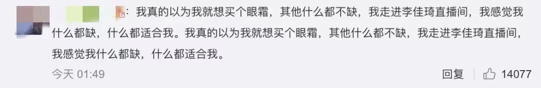 有微博网友表示,“我真的以为我就想买个眼霜,其他什么都不缺,我走进李佳琦直播间,我感觉我什么都缺,什么都适合我。我真的以为我就想买个眼霜,其他什么都不缺,我走进李佳琦直播间,我感觉我什么都缺,什么都适合我。”