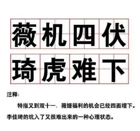 “薇机四伏,琦虎难下”,是当天晚上网民对两人直播间的形容:特指又到双十一,薇娅福利的机会已经四面埋下,李佳琦的坑入了又很难出来的一种心理状态。
