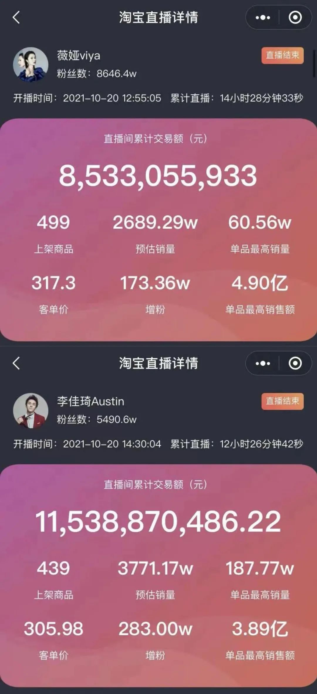这一数字,追平了2019年双十一当天淘宝直播近200亿的总交易额;据证券时报网报道,两位主播的带货总额已超过4000家上市公司全年营收。