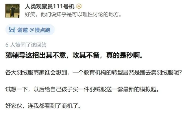 猿辅导有关人员随后回应称,开展羽绒服业务的业务主体并非猿辅导,而是集团新投资设立的消费类子公司,由独立团队运营;猿辅导还是以教育为主业。