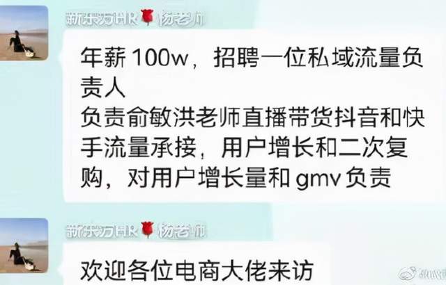 本周,一张来源不明的聊天截图显示,新东方开出百万年薪,招聘私域流量负责人,工作内容包括俞敏洪直播带货的抖音快手流量承接、用户增长和复购等。