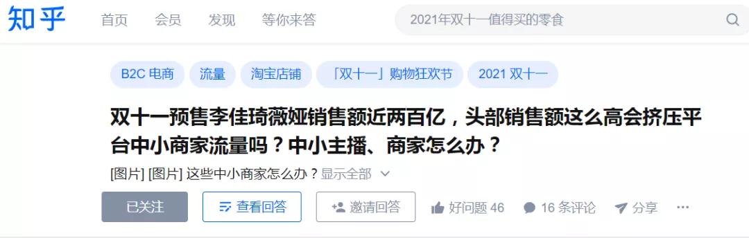 这对商业生态的未来来说,并不是好事。日前在知乎上有个热门提问:《双十一预售李佳琦薇娅销售额近两百亿,头部销售额这么高会挤压平台中小商家流量吗?中小主播、商家怎么办?》,大量的回复都道出了当前商家的困局。