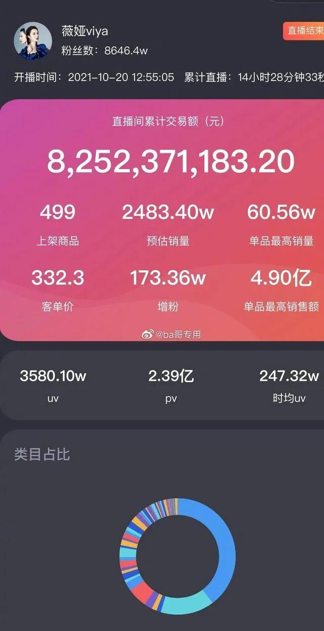 在10月20日下午开始的直播,12个半小时的时间里,李佳琦直播间成交额达106.5亿元。薇娅比李佳琦提前半小时开播,一天内的成交额也达82.5亿元。