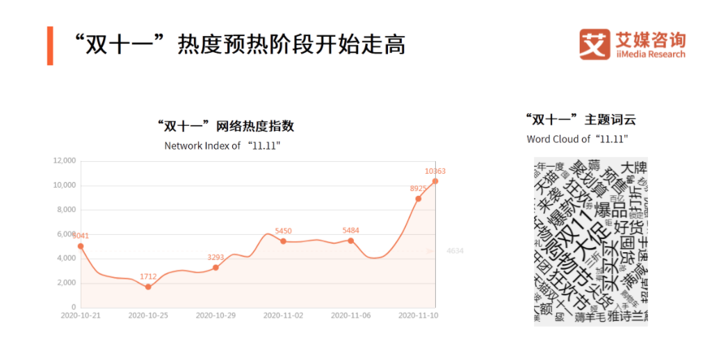参考去年的案例,在整个天猫双11活动期间内,随着不同环节的开展,活动的网络热度会呈现出明显的递增趋势,每一次关键活动的节点内均会出现一次流量高峰,其中首波活动预售期的热度较高,但因为距离双11当天的时间较远,网络热度总体上不如11月之后的其它活动。
