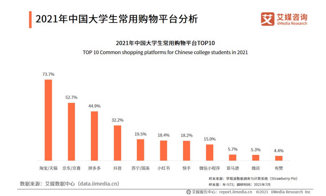 在艾媒咨询的2021中国大学生常用购物平台分析和Mob研究院的“后浪”网购图鉴中指出,淘宝在这两大榜单中均排在首位,特别是在大学生群体中淘宝/天猫的份额占比达到73.7%,远远超过第二名的京东/京喜。当前我国的在校大学生人数为4183万,一旦这部分人群的购买意愿得到一定程度的释放,将形成不容小觑的消费规模。