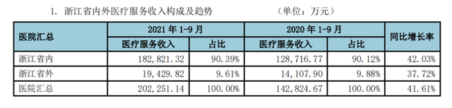 从财报展示的数据来看,截至2021年上半年末,通策医疗已有营业口腔医疗机构50 余家,位居浙江省内的38家;今年1-9月,浙江省内医院共为通策医疗贡献了18.28亿元的医疗服务收入,占比超过90%,门诊人次占到总人次的86.87%。