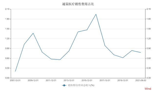 据节点财经整理,上市至今,通策医疗的销售费用率一直稳定在2%以内,今年前三季度仅为0.78%;2018-2020年,公司主营业务毛利率高达43.14%、45.93%及45.05%。