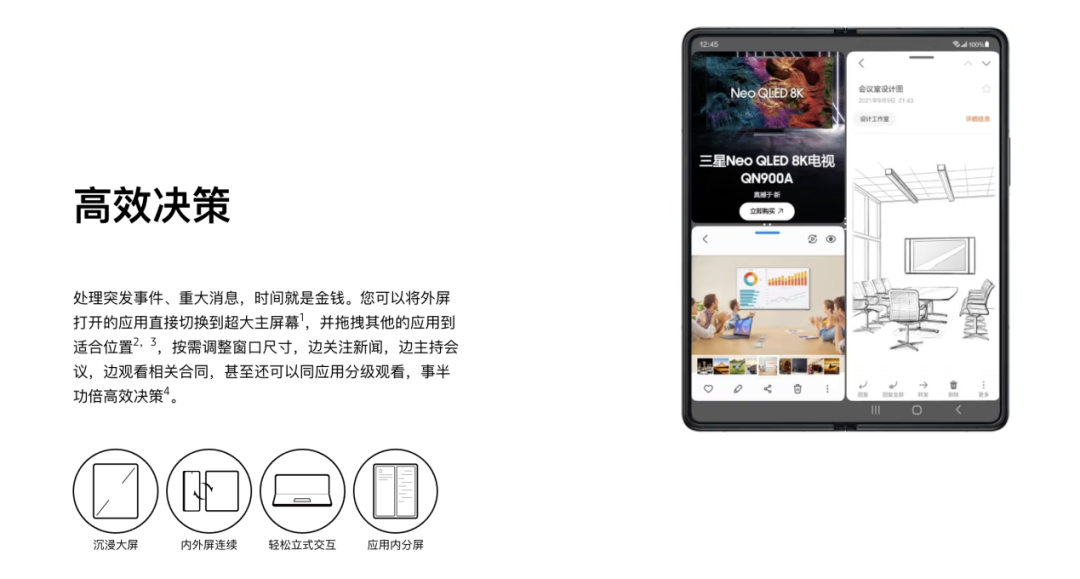 为折叠屏提供的另一个提高工作效率的场景就是分屏协同工作。在三星官方的宣传图中,全部展开的屏幕可以支持三个应用同时呈现,在文案中也都是将“关注新闻”、“主持会议”、“观看合同”等使用场景集合在一起来勾勒出商务精英人士的工作使用场景。