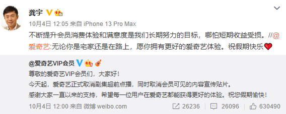 “不断提升会员消费体验和满意度是爱奇艺长期努力的目标,哪怕短期收益受损。”消息宣布的当天,龚宇在微博上说道。