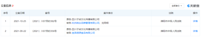 天眼查显示,10月25日四川子柒文化传播有限公司(下称“子柒文化”)新增一条立案信息,其中子柒文化作为一审原告,MCN机构杭州微念品牌管理有限公司(下称“杭州微念”)与其董事长刘同明作为一审被告,经办法院为四川省绵阳市中级人民法院。