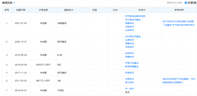 杭州微念在资本市场中也颇受青睐,自2016年来,其屡获融资,包括芒果文创基金、新浪微博基金、字节跳动战略投资部等在内的诸多巨头均有入股。而杭州微念收获第一笔融资的时间,正是李子柒短视频起步的2016年。有报道称,杭州微念目前估值已达50亿元。
