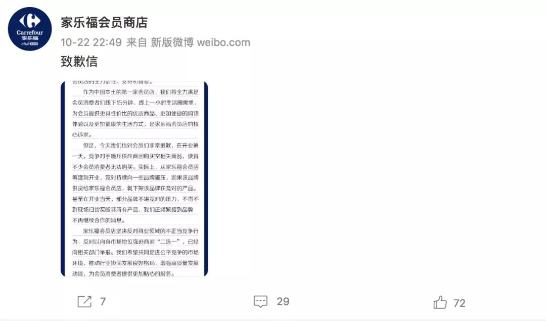 在致歉信中,家乐福会员商店自称遭遇竞争对手施压,在开业第一天被供货商回购买空相关商品,从而致使不少会员消费者无法购买。