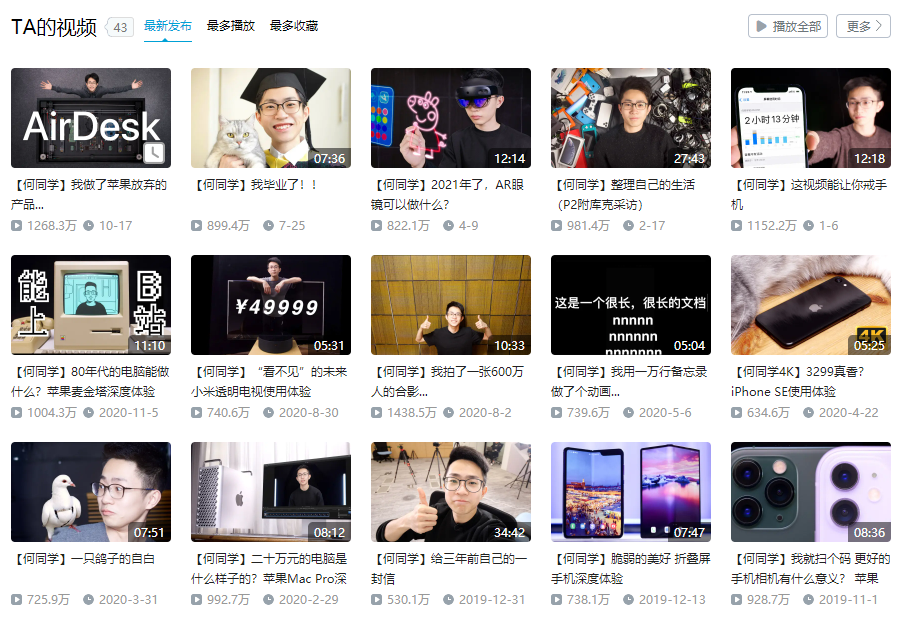 何同学每个视频的播放量几乎都近千万,图源:Bilibili