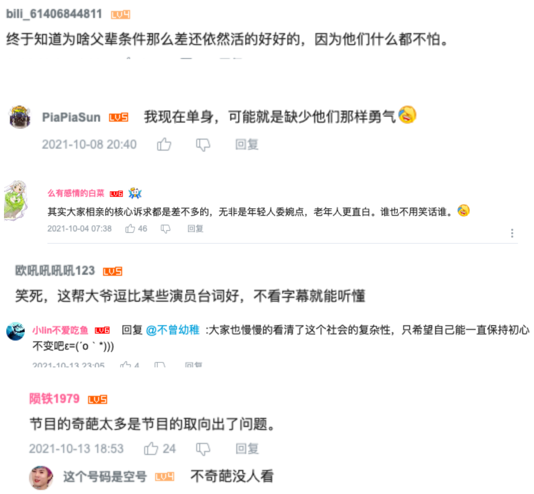 最早这些节目的片段是微博搞笑博主的一个数据反馈很好的更新素材,动辄五百多万次观看,近一万多评论,套用到各种emo情绪或者时下流行的网络流行语当中,比如“我老了可能也会去相亲”、“大爷怎么不照照镜子”、“大妈人间清醒”、“社交牛逼症”。