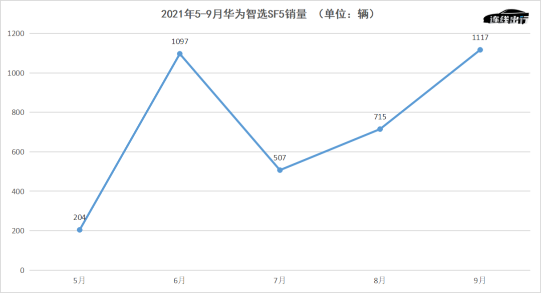 在华为智选SF5开启销售后,其官方曾有表示开售两天订单突破3000辆,一周订单突破了6000辆,但据乘联会数据显示,该车型5-9月销量依次为204辆、1097辆、507辆、715辆和1117辆。