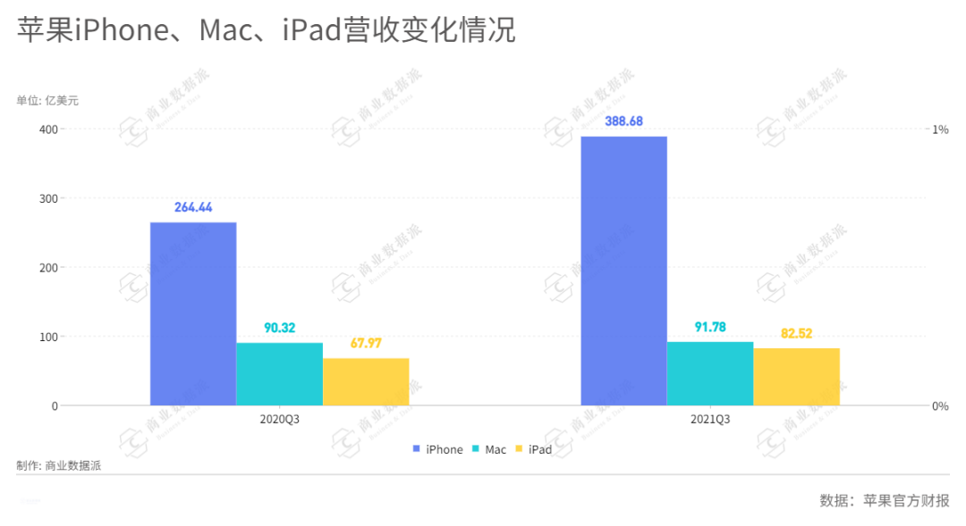从财报中能够看出,手机业务依旧收入占比最高,收入为388.68亿美元,占总收入的46.62%,不过,相比去年同期手机业务占比的40.87%,苹果在手机部分的收入比重有所提升。