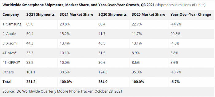 根据IDC今年第三季度数据,全球智能手机出货量达到3.312亿部,整体出货量下降了6.7%,但苹果凭借iPhone依旧达成了5040万部出货记录,较去年同期增长了11.7%,增长速度仅次于排名第一的三星,从数据中也能够看出,由于华为暂时退出全球高端智能手机市场竞争,三星、苹果成为了最大受益者。