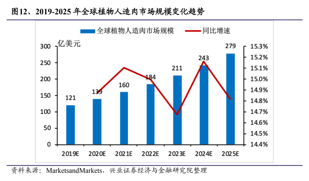MarketsandMarkets数据显示,2019年全球植物性人造肉的市场规模约为121亿美元,其预计每年将以15%的复合增长率增长,到2025年达到279亿美元的规模,行业普遍预估,全球植物肉类市场最终会超过千亿美元规模。