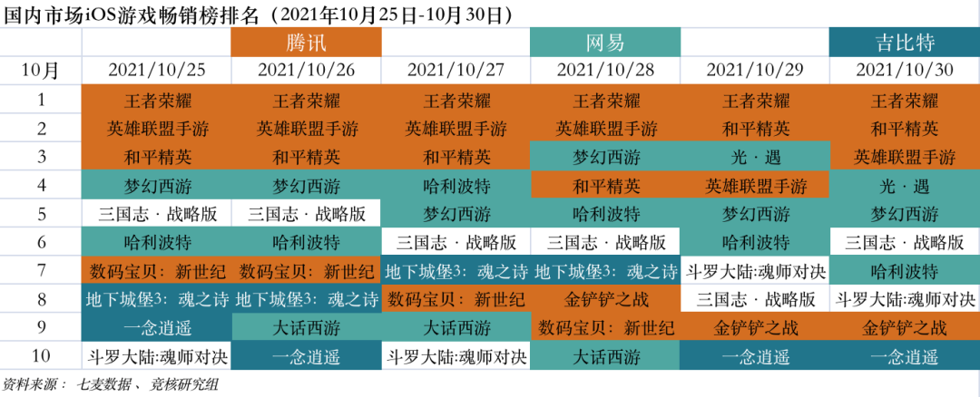 国内市场2021年10月25日—10月30日iOS游戏类畅销榜,Top10项目被腾讯游戏、网易游戏、雷霆游戏、阿里游戏、三七互娱包揽。