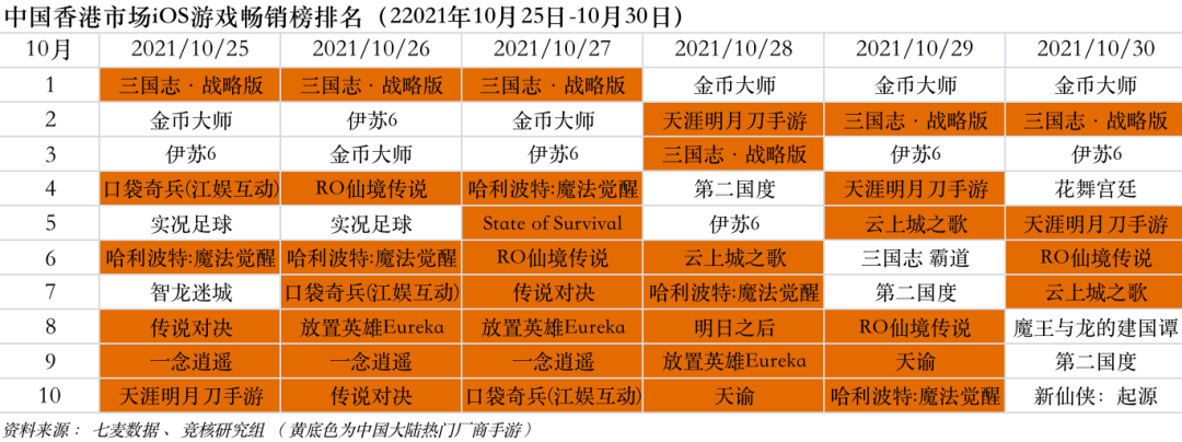 此外,包括阿里游戏《三国志·战略版》、厦门极致网络《放置英雄Eureka》、网易游戏《Sky光·遇》《哈利波特》、腾讯游戏《天涯明月刀手游》《传说对决》、三七互娱《斗罗大陆:魂师对决》、字节跳动《RO仙境传说:新世代的诞生》、江娱互动《口袋奇兵》等期内闯进香港App Store游戏畅销榜Top5内。