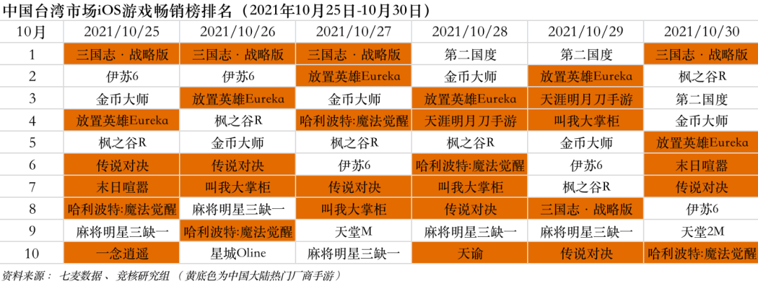 中国台湾市场2021年10月25日—10月30日iOS游戏类畅销榜中,阿里游戏《三国志·战略版》、极致网络《放置英雄Eureka》、腾讯游戏《天涯明月刀手游》进入Top3。
