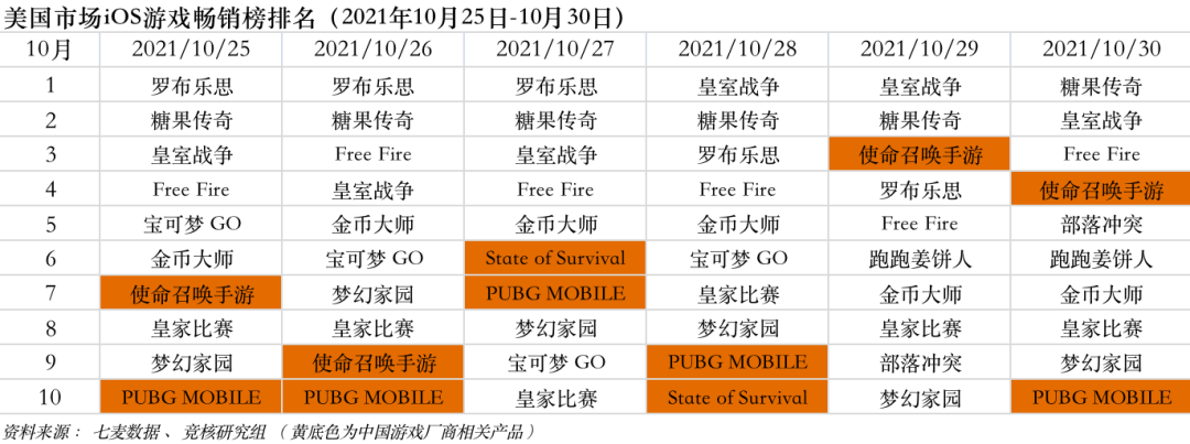 美国市场2021年10月25日—10月30日iOS游戏类畅销榜中,国产手游包括腾讯游戏《使命召唤手游》《PUBG MOBILE》、FunPlus《State of Survival》。