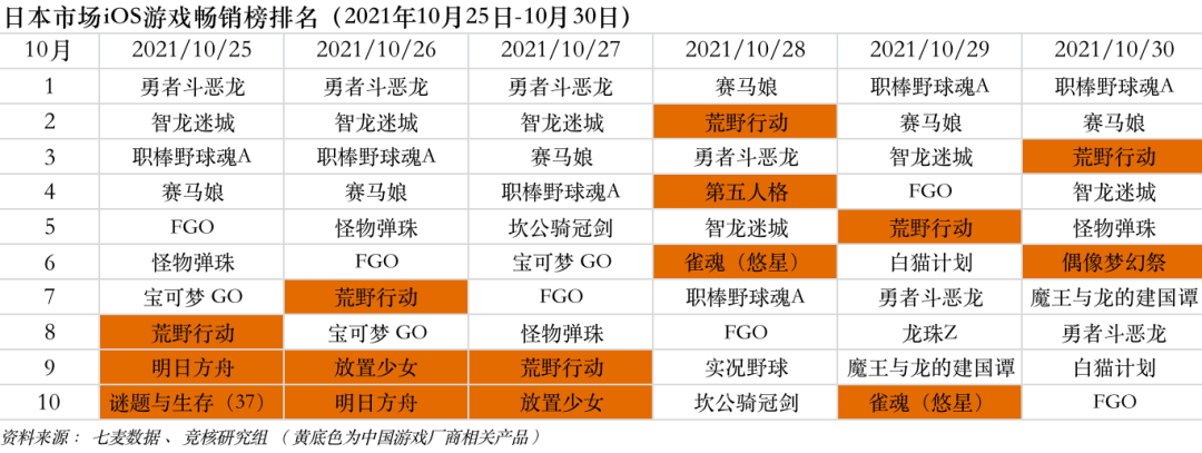 此外,包括网易游戏《荒野行动》《第五人格》、鹰角网络《明日方舟》、有爱互娱《放置少女》、悠星网络《雀魂》、乐元素《偶像梦幻祭》等,期内也闯进日本App Store游戏畅销榜Top10。