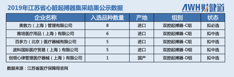 2019年8月,江苏省开展国内首次心脏起搏器集采,最终价格平均降幅为15.86%,最高降幅38.18%。美敦力旗下8款植入式心脏起搏器产品均显示为“拟必选”,雅培、百多力、波科国际旗下共16款植入式心脏起搏器产品也均中选。