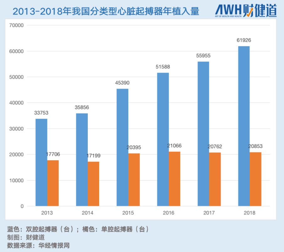 而如下图,据相关统计数据,双腔起搏器在我国2013至2018年的植入数量占据压倒性地位。