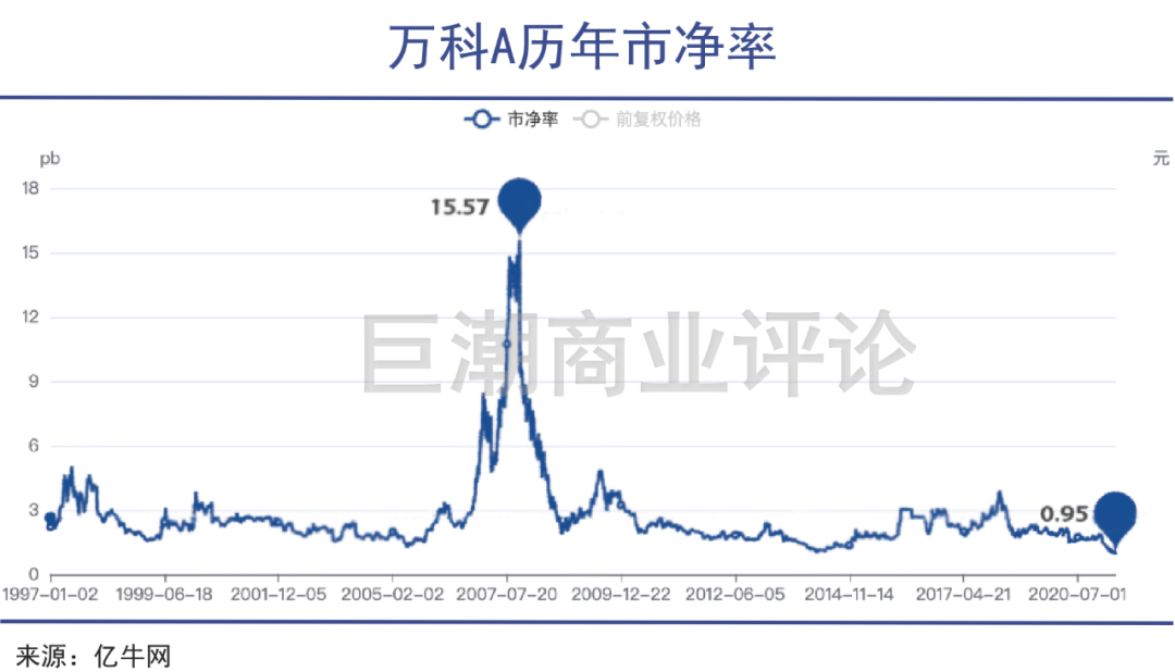 10月29日,万科股价低开低走,市净率跌至0.95,这是其25年以来首次跌破净资产。