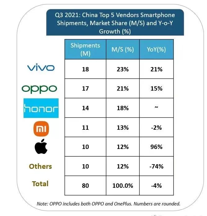 具体而言,三季度vivo和OPPO分别凭借23%、20%的市场份额占据国内手机市场的前两名。小米14%的市场份额被荣耀15%的市场份额超过,从第二名跌落到第四名。