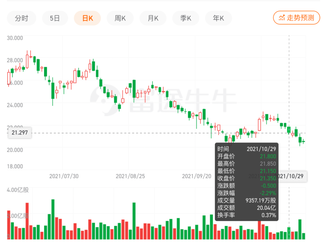 对于小米三季度成绩的下滑,资本市场很快给出了反应。10月29日报告发布当天,小米在港股的表现呈下滑趋势。据富途牛牛数据显示,小米当天股价最低跌到了21.5港元/股。而对比今年1月份,小米股价最高时达到了35.9港元/股,如今下跌近40%。截止发稿,小米股价降至20.75港元,市值为5207.31亿港元。