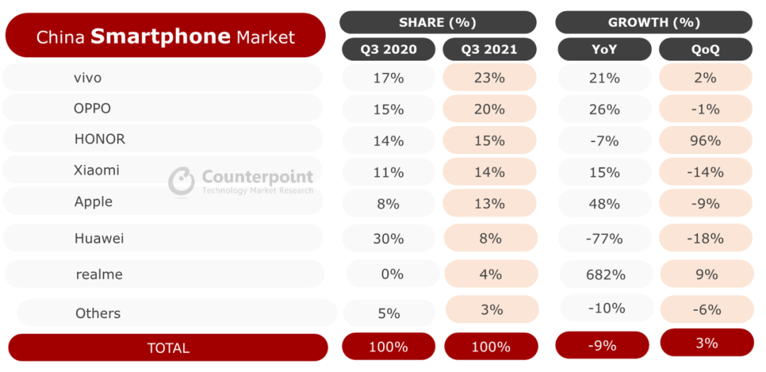 从国内整体手机市场看,Counterpoint Research发布报告所示,2021年第三季度中国市场智能手机销量同比下降9%,但环比增长3%,达到7650万部。