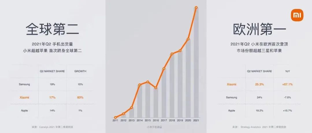 三个月前,小米的市场份额首次登顶全球第二。根据Canalys发布的第二季度全球智能手机市场份额的报告,小米市场份额为17%,智能手机销量超越了苹果,首次晋升全球第二。