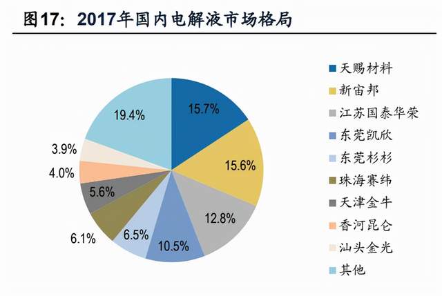 2014年,六氟磷酸锂国产化率接近90%。伴随着国内新能源汽车进入高速发展阶段,整个锂电池产业链快速上量,天赐材料作为宁德时代最大的电解液供应商,2017年借势成为了全球第一大电解液厂商。