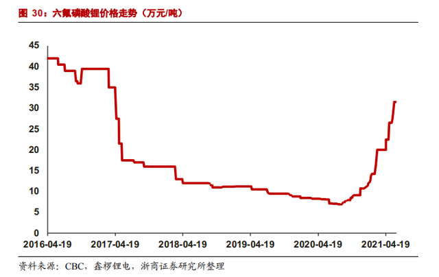 供不应求时期,六氟磷酸锂生产商纷纷扩产,但随着2017年新能源汽车需求增速回落,以及六氟磷酸锂的产能释放,供需格局倒转,六氟磷酸锂价格暴跌,行业用了4年逐步出清产能,直到2021年又迎来了一个景气期。