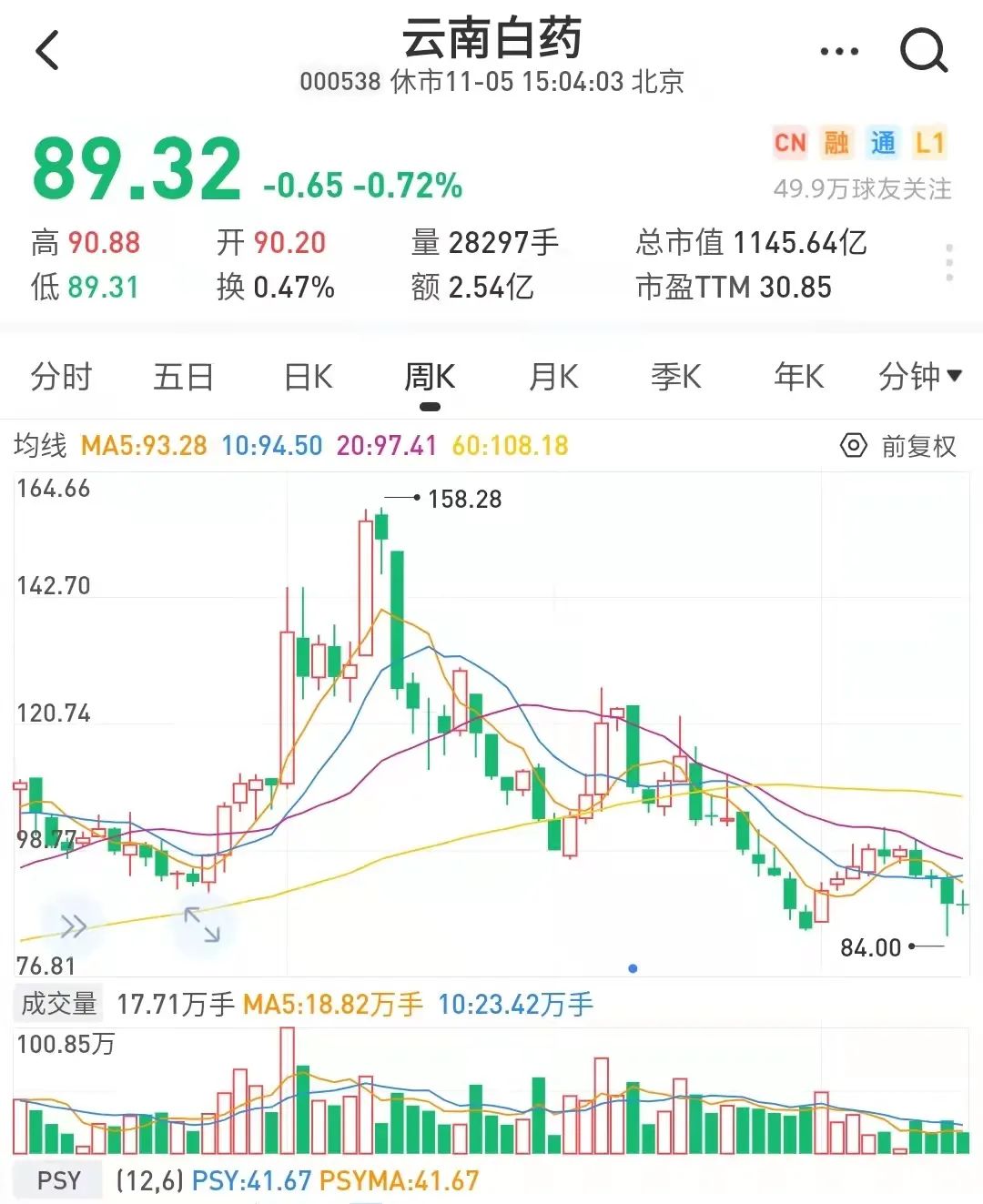 今年年初云南白药的股价一度最高上涨至159.38元,市值一度超过2000亿元,但截止到11月5日,其股价已经跌落至89.32元,市值1145元。