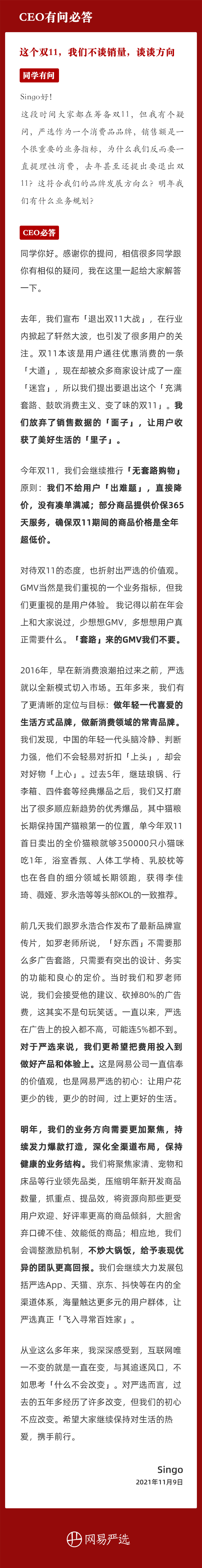 据了解,问题来自网易严选内部论坛《CXO有问必答》栏目的员工问答。该员工问到:“严选作为一个消费品品牌,销售额是一个很重要的业务指标,为什么我们反而要一直提理性消费,去年甚至还提出要退出双11?这符合我们的品牌发展方向么?明年我们有什么业务规划?”据说,这也是严选管理层在接受媒体采访时被问到次数最多的几个问题。