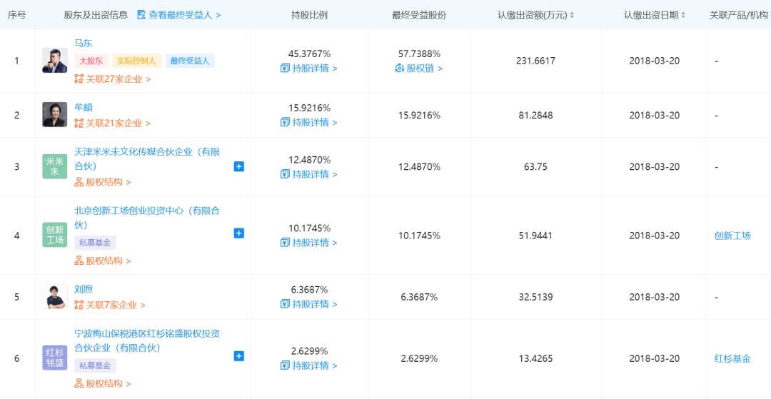 米未与笑果文化都成立于2015年前后。据企查查显示:北京米未传媒有限公司成立于2015年8月31日,致力于互联网内容的生产平台建设和优质内容开发。由创始人马东(CEO)、联合创始人牟頔(CCO)和刘煦(CMO)共同创立。目前,公司注册资本510万元人民币,马东作为大股东持股45%,牟頔15%。