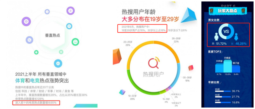 微博的2018年MSI观赛数据上,只有35%观赛用户是女性;而S10的观赛报告里,女性用户占了48.28%。2021年6月数据,微博热搜用户19-29岁占76%,其中61.6%的00后用户与54.1%的90后用户为女性用户,2021上半年进入前十热搜的电竞热词数量增长了65%。