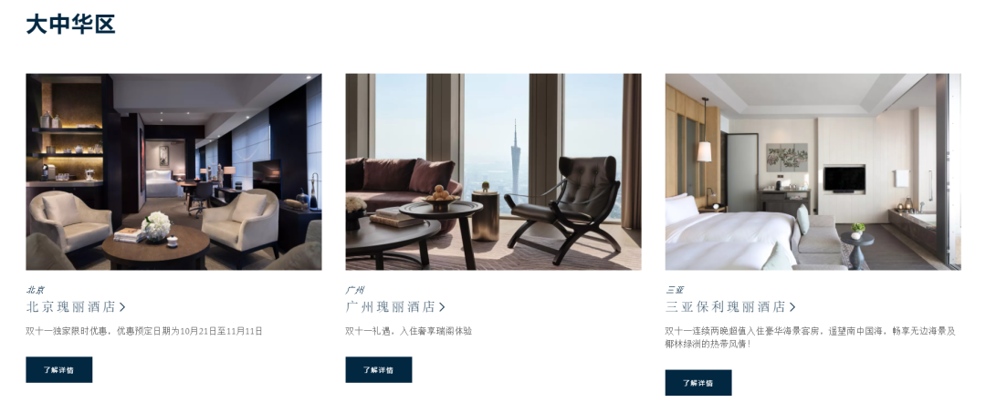 瑰丽酒店集团官网的双十一瑰丽探奇,香格里拉酒店集团官网的开启秋日“魔法盒”,洲际酒店集团针对双十一推出了“心动限时套房6.8折礼遇”,高星酒店集团在尝试利用自身的忠诚会员体系带来尽可能多的双十一转化。