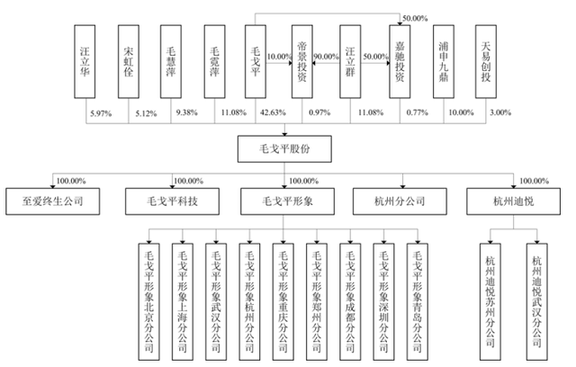 从股份持有情况来看,毛戈平本人持有42.63%的股份,其妻汪立群则直接持有11.08%的股份。且夫妻二人通过控制帝景投资、嘉驰投资间接持有毛戈平1.74%股份。此外,毛戈平的姐姐毛霓萍、毛慧萍,妻子弟弟汪立华也担任了公司高管。