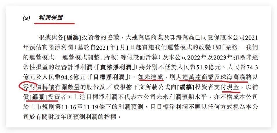 据万达商管招股书中公开披露,王健林为实控人的大连万达商业及珠海万赢与投资者签署了对赌协议。该协议约定,万达商管须分别在2021和2022年以及2023年预估净利润不低于51.9亿元、74.3亿元、94.6亿元。